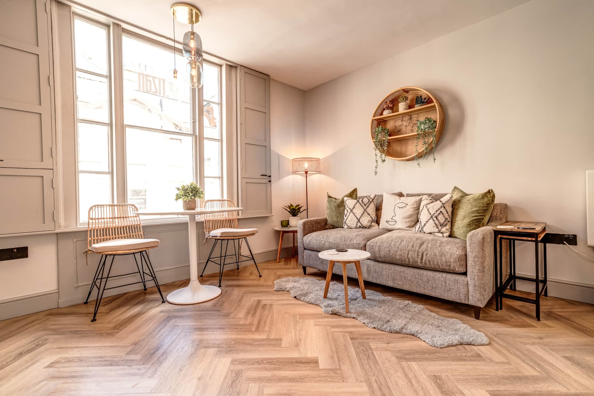 An urban dweller's delight, these cool Skandi and Japandi–style one bedroom apartments put you at the centre of exciting city events. These petite period apartments above Artizan hairdressers have chic schemes, with wood effect flooring throughout and a contemporary kitchens and bathrooms. Both apartments sleep two in one bedroom (double bed), there is a sofa bed in the lounge, where a third person may stay but note the only bathroom is en suite to the main bedroom. The bedrooms are at the rear of the apartments and are serene and quiet.